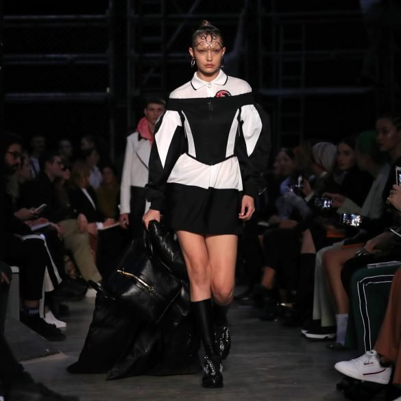 Gigi Hadid had her hair curled and gelled across her forehead, making her look completely different from all her other...