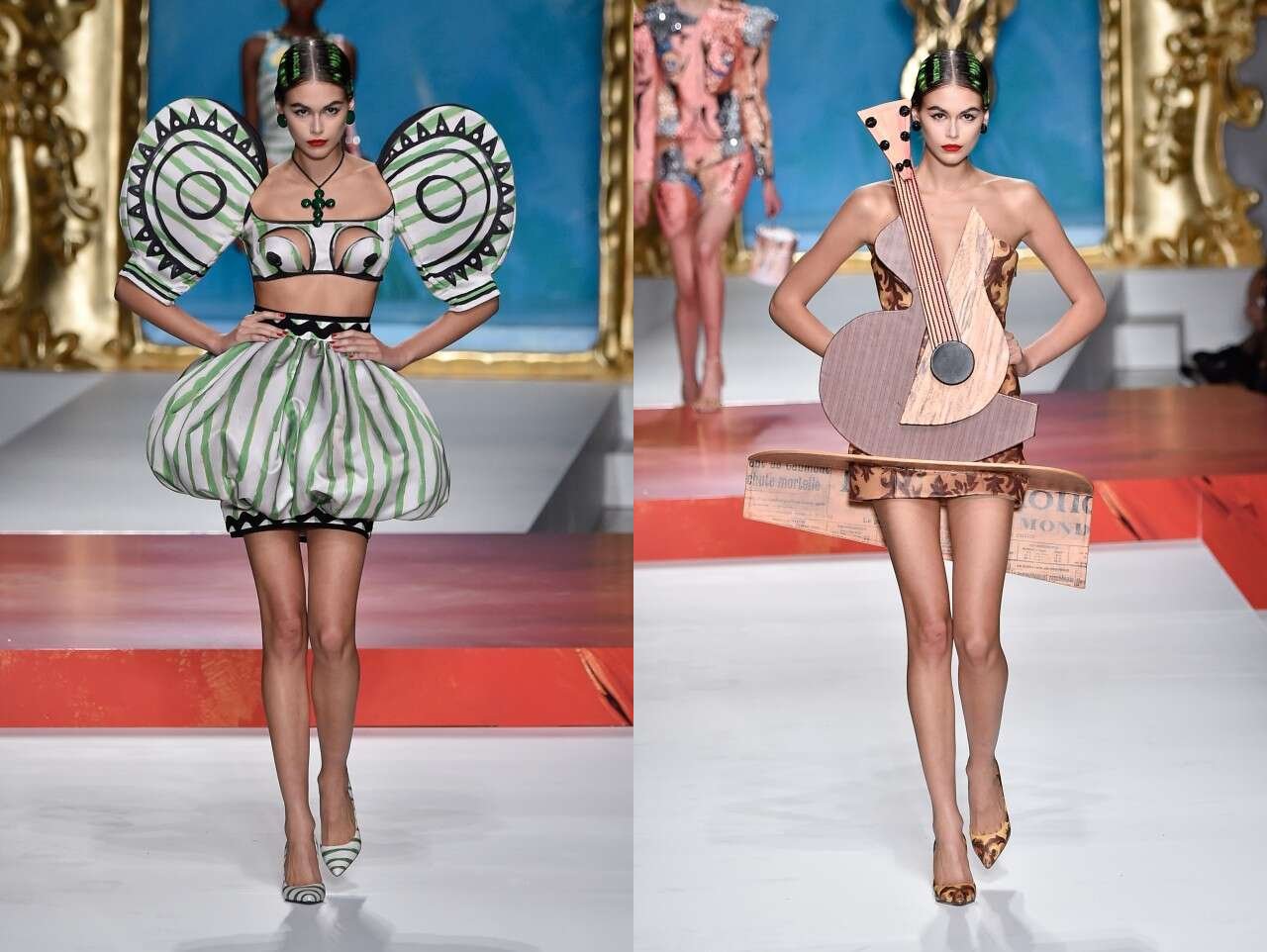 For Kaia, a guitar in an abstract, structured dress. Wearing a red lip and a sleek, pulled-back hairdo with green paintbrush strokes on the hair, the 18-year-old daughter of Cindy Crawford also wore a striped green two-piece set, accented by wing-like sleeves and a bubble hem skirt.