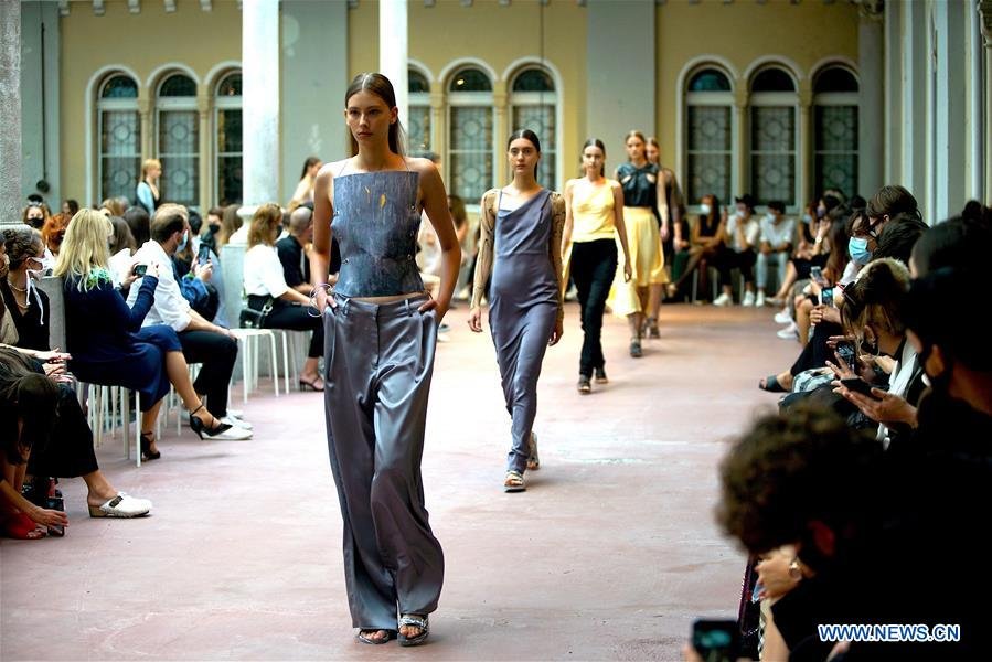 Models present creations by designer Denisa Dovala during the Mercedes-Benz Prague Fashion Week in Prague, the Czech Republic, on Sept. 5, 2020. (Photo by Dana Kesnerova/Xinhua)